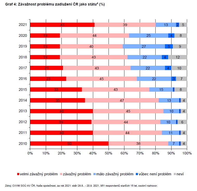 Vnímání míry zadlužení státu jako závažného problému narostlo od loňského roku o 17 procentních bodů, přitom procento odpovědí, že jde o velmi závažný problém, se více než zdvojnásobilo. Hodnocení závažnosti zadlužení obyvatel se meziročně nezměnilo.
