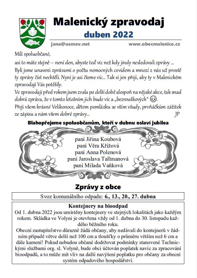 PŘEČTĚTE SI U NÁS: Malenický zpravodaj – duben 2022