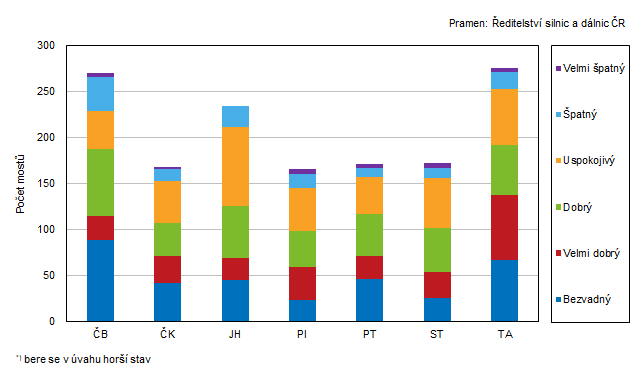 Dle stavu nosné konstrukce nebo spodní stavby mostů (bere se v úvahu horší stav) se v kraji nacházelo 336 mostů v bezvadném stavu, ale také 128 mostů, jejichž stav byl hodnocen jako špatný, 26 mostů bylo ve velmi špatném stavu a 4 mosty byly zařazeny do kategorie neurčeno. V kraji se nevyskytoval žádný silniční tunel ani brod.