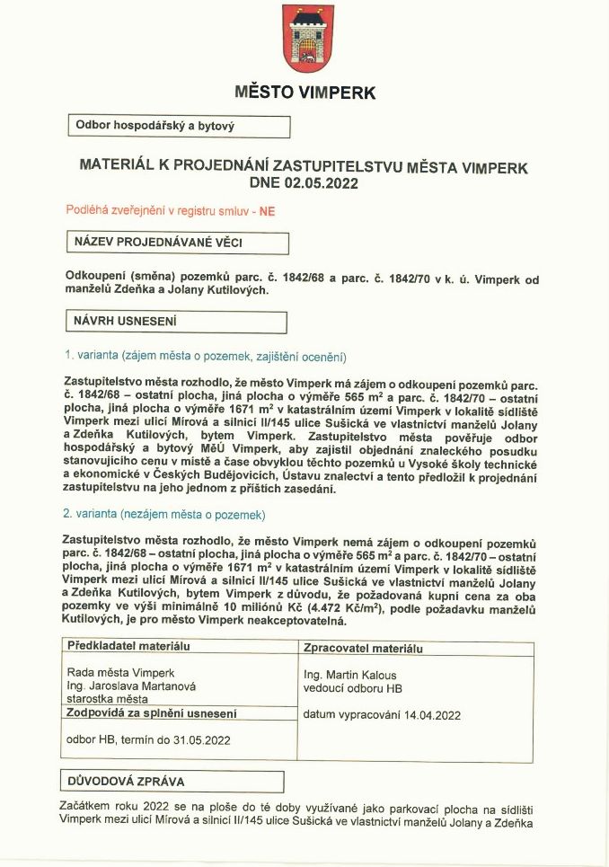 Na programu nadcházejícího 33. zasedání městského zastupitelstva ve Vimperku bude také bod uvedený v programu Odkoupení (směna) pozemků parc. č. 1842/68 a parc. č. 1842/70 v k. ú. Vimperk od manželů Zdeňka a Jolany Kutilových.