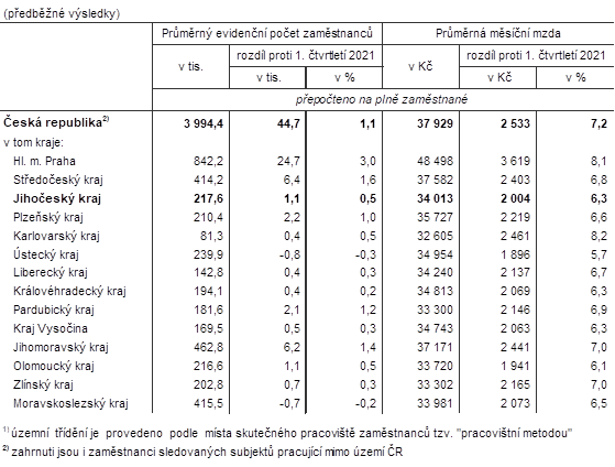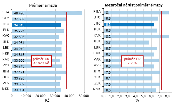 Podle dosažené hodnoty průměrné mzdy se Jihočeský kraj umístil na deváté příčce. Při porovnání přírůstku mzdy v 1. čtvrtletí 2022 v absolutních i relativních hodnotách obsadil Jihočeský kraj třetí nejnižší příčku (+2 004 Kč; 6,3 %). Z pohledu absolutní výše průměrných mezd zaostávaly mzdy v Jihočeském kraji proti průměru za celou republiku o 3 916 Kč a proti průměru za hlavní město Prahu byl zaznamenán rozdíl téměř 14,5 tisíce Kč. V rámci celé ČR mzdy rostly ve všech krajích. Nejvyšší přírůstek průměrné mzdy byl v absolutních hodnotách v hlavním městě Praze (+3 619 Kč). V relativních hodnotách obsadil první místo Karlovarský kraj (+8,2 %). Nejnižší nárůst v absolutních i v relativních hodnotách byl zaznamenán v Ústeckém kraji (+1 896 Kč; +5,7 %). V hlavním městě tradičně zůstávají nejvyšší průměrné mzdy (48 498 Kč). Praha převyšovala průměrnou mzdu České republiky o téměř 30 %.