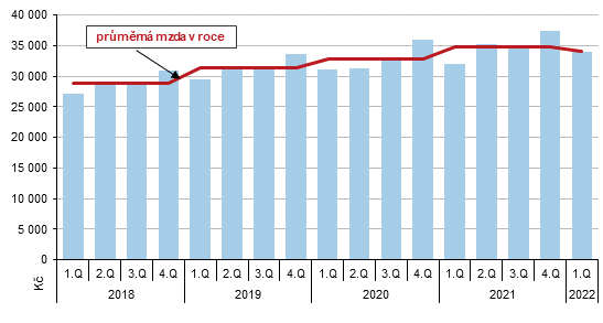 Průměrná měsíční mzda v národním hospodářství celé České republiky v 1. čtvrtletí 2022 měla hodnotu 37 929 Kč, což je o 2 533 Kč více než ve stejném období minulého roku. Ve srovnání s 1. čtvrtletím 2021 vzrostla průměrná mzda v ČR nominálně o 7,2 %. Spotřebitelské ceny se však v ČR za uvedené období zvýšily o 11,2 %, a proto mzda reálně klesla – o 3,6 %.