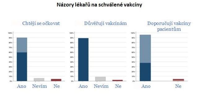 První ze zmíněných dotazníkových šetření proběhlo v únoru 2021 mezi českými lékaři ze všech částí republiky. Zaměřovalo se na názory lékařů týkající se schválených vakcín. Z 10 tisíc lékařů, kteří se průzkumu mínění účastnili, věřilo vakcínám 89 %. Zároveň jich 90 % již bylo očkováno nebo se plánovalo naočkovat. Až 96 % lékařů by pak doporučilo očkování svým zdravým pacientům.