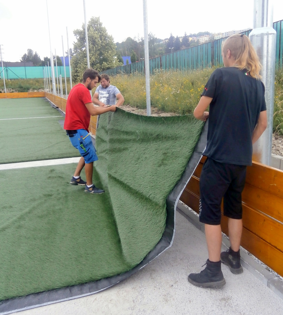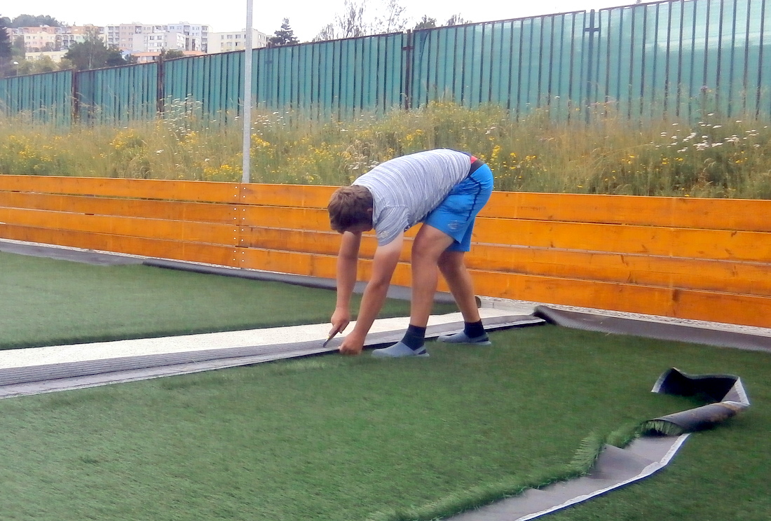 NAŠE MĚSTO VIMPERK: Na stavbě – víceúčelové hřiště ve sportovním areálu, pokládka umělého trávníku (24. června 2022)