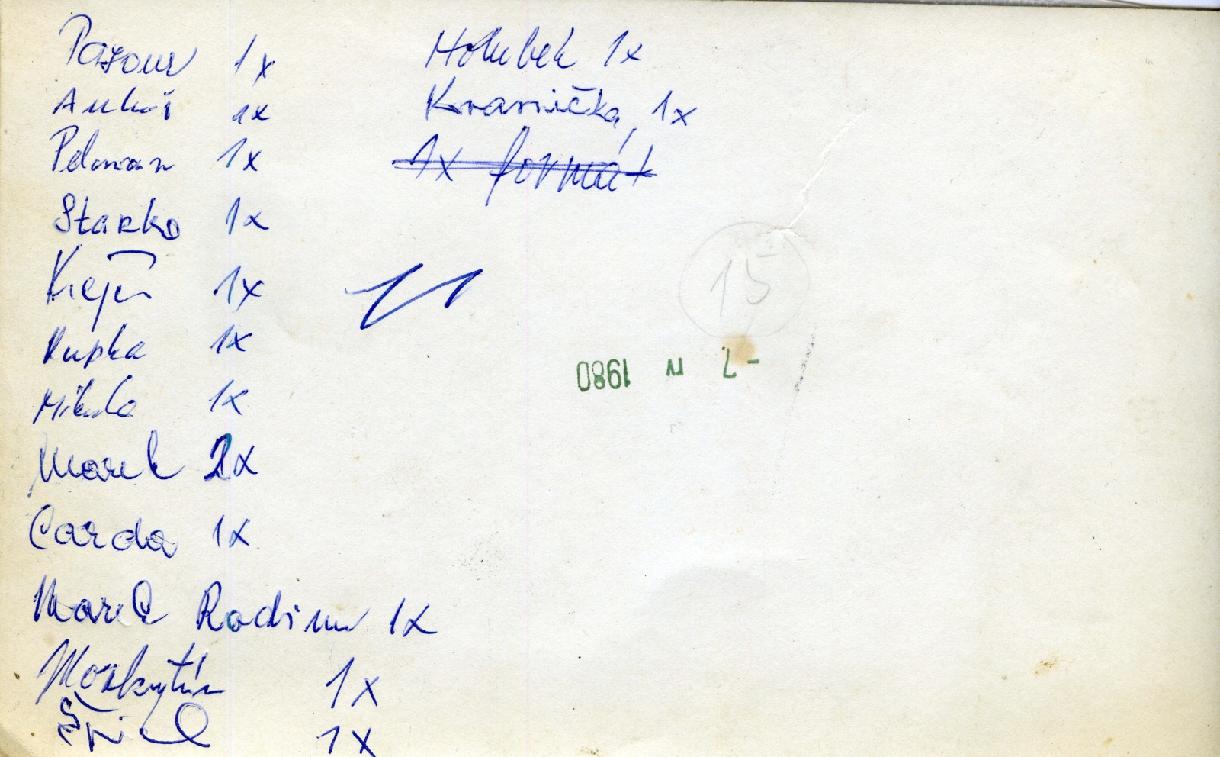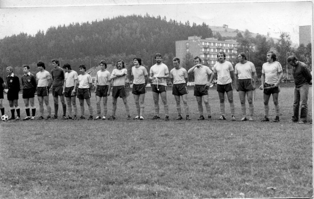 Fotbalisté vimperského Šumavanu při zahájení přátelského utkání se Spartou Praha, které řídil Martin Horbas (první zleva), tehdy mezinárodní a prvoligový rozhodčí z Vimperka. Podle zadní strany byla fotografie zhotovena 7. září 1980. Jména pak patří aktérům zápasu. Na snímku zcela vpravo trenér Šumavanu Petr Koška.