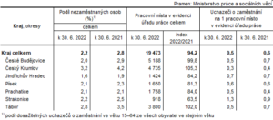 Na jedno volné pracovní místo připadalo k 30. červnu 2022 v Jihočeském kraji 0,5 uchazečů (5. nejnižší počet mezi kraji), přičemž meziročně došlo k nepatrnému snížení (−0,1).