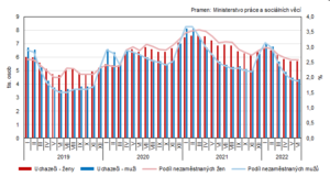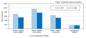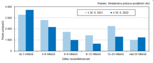 K 30. červnu 2022 bylo v kraji 58,4 % žadatelů o práci evidováno kratší dobu než šest měsíců. V rámci meziročního srovnání však došlo k nárůstu počtu uchazečů v kategorii nad 24 měsíců (+21,1%).