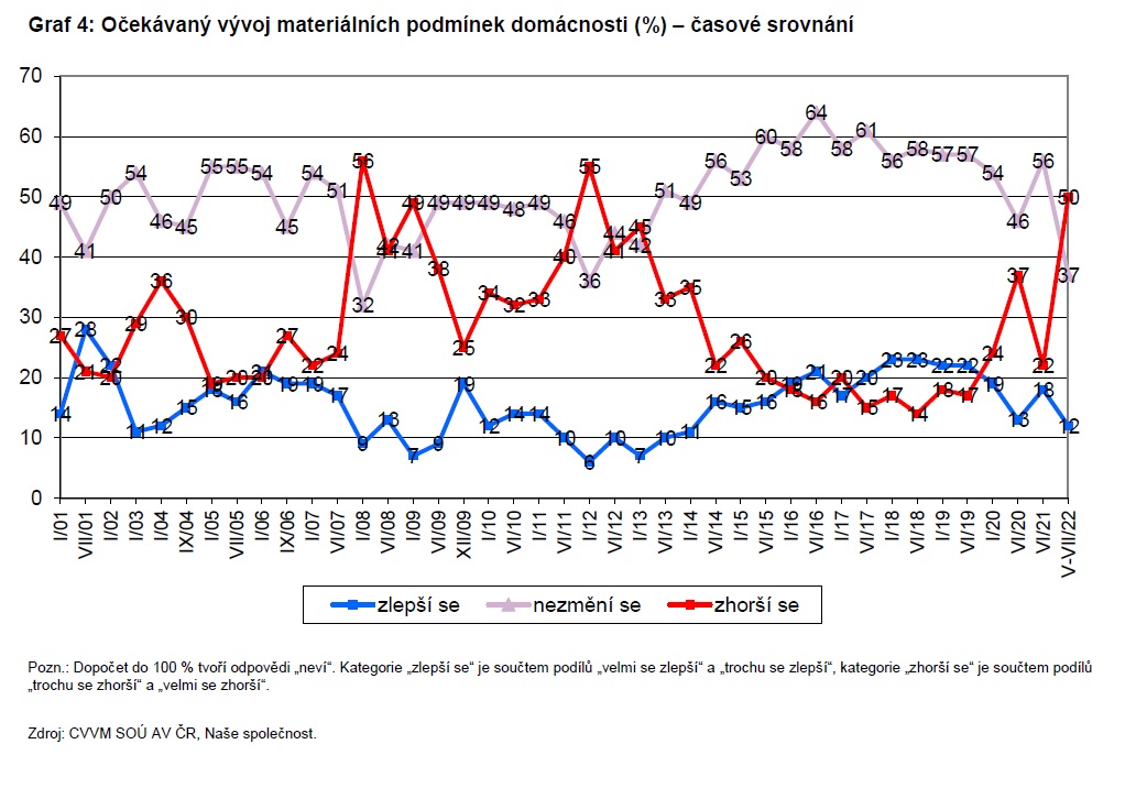 Přibližně polovina (51 %) Čechů hodnotí materiální životní podmínky svých domácností jako dobré, 11 % je pokládá za špatné a 37 % za „ani dobré, ani špatné“.