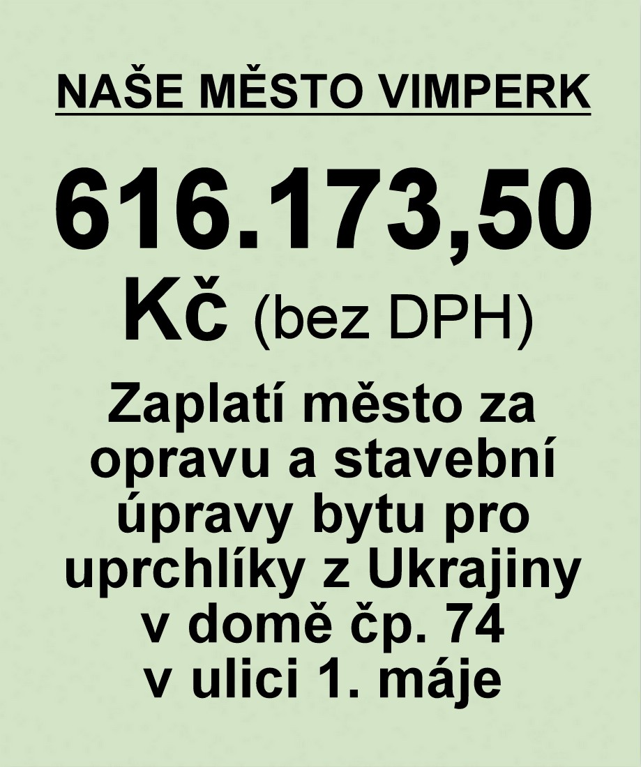 Rada města rozhodla na základě jednání a doporučení komise pro otevírání obálek výběrového řízení „Oprava bytu, stavební úpravy čp. 74/1 v ul. 1. máje, Vimperk – pro uprchlíky z Ukrajiny“ o výběru nabídky společnosti MONTIMA s. r. o., Pivovarská 104/23, Vimperk IČ 28085094 ve výši 616.173,50 Kč bez DPH a uzavření smlouvy na dodávku stavebních prací v rozsahu výběrového řízení.