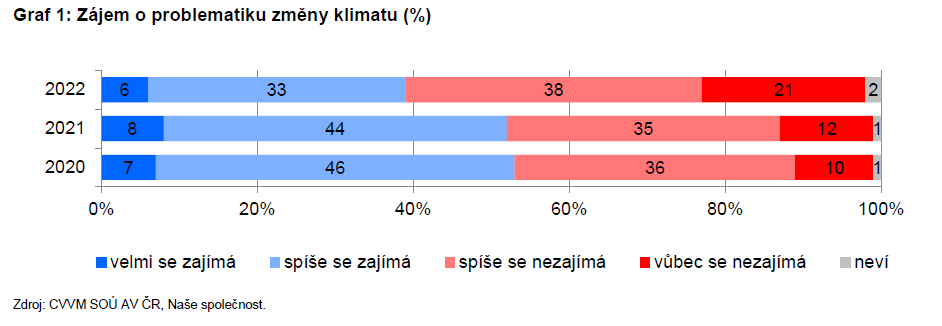 O problematiku změny klimatu se zajímají necelé dvě pětiny (39 %) dotázaných, z toho 6 % se „velmi zajímá“ a 33 % „spíše zajímá“. Necelé tři pětiny (58 %) dotázaných se v určité míře obávají dopadů změny klimatu (14% velmi, 44 % spíše), naopak obavy nepociťuje 39 % dotázaných.
