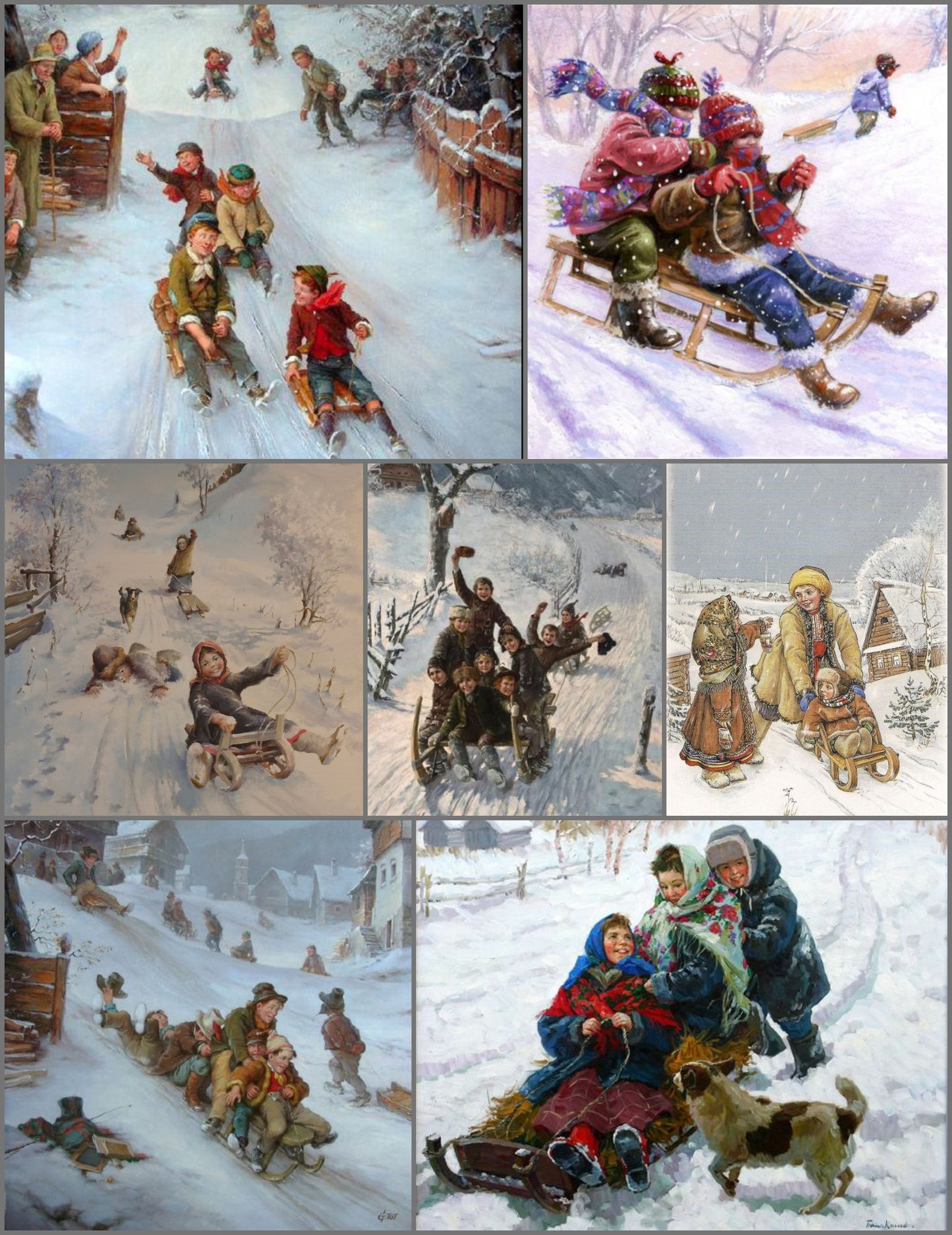 Dárkem, který nacházely děti pod stromečkem, byly sáňky. Ale pozor i sáňky podléhaly módě. V první polovině 30. let byly nejoblíbenějším modelem „rohačky“. Rohačky bývají veliké nebo menší, a snem všech hochů bývají rohačky, které se řídí napřed kolem, podobným volantu u automobilu Všechny tyhle sáně prohánějí se vesele s vršku dolů, kdy se sjíždí bleskem a pak následuje dlouhá cesta na vršek. Často při jízdě se sáně nějak otočí, jak hoši říkávají, „udělají hodiny”, celá posádka se vyklopí do sněhu, ale to sáňkářům nezkazí dobrou náladu.