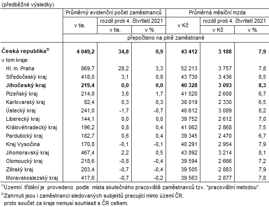V samotném 4. čtvrtletí 2022 činila průměrná hrubá měsíční nominální mzda (přepočtené počty zaměstnanců) v České republice 43 412 Kč, nárůst o 7,9 %. V Jihočeském kraji dosáhla průměrná mzda ve 4. čtvrtletí 40 328 Kč, což byl v mezikrajském srovnání meziročně čtvrtý nejvyšší nárůst v absolutních (+3 093 Kč) a v relativních hodnotách (+8,3 %), po Středočeském kraji dokonce druhý nejvyšší. Zvýšení mezd v absolutních číslech bylo zaznamenáno nejvíce v hlavním městě Praze (+3 757 Kč), naopak nejnižší bylo v Karlovarském kraji (+2 330 Kč). V relativních hodnotách si nejvíce polepšil zmiňovaný Středočeský kraj (+8,5 %), naopak nejmenší relativní zvýšení bylo zaznamenáno v Karlovarském kraji (+6,5 %).