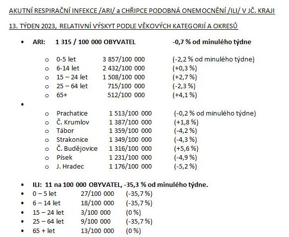 JIŽNÍ ČECHY: Aktuální informace hygieniků kraje o nemocnosti – 13. týden ´23
