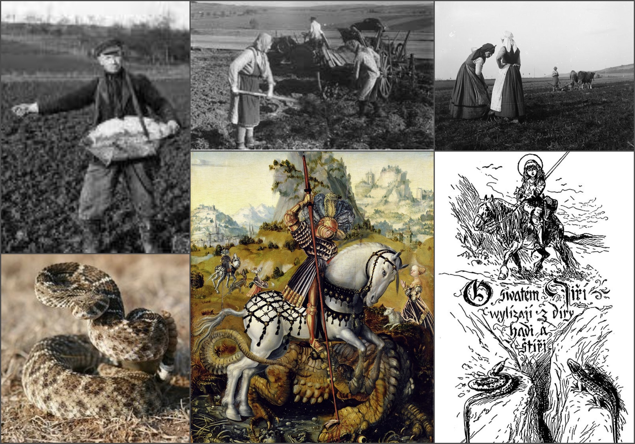 Příběh o sv. Jiří a drakovi je východního původu; do našich končin byl přinesen křižáky a upraven do romantické podoby. Plně rozvinutá západní verze legendy vypráví, jak si u pramene zásobujícího město Kyréna v Libyi, nebo město Lýdii postavil hnízdo drak. Obyvatelé museli každý den kvůli vodě na chvíli vylákat draka z hnízda. Jako návnada sloužila lidská oběť určená losem. Když los padl na královskou dceru, zoufalý král marně prosil o milost. Princezna byla předložena drakovi. V pravou chvíli se objevil zrovna kolem projíždějící Jiří, postavil se drakovi, zabil ho a princeznu zachránil. Vděční občané se zřekli pohanství a přijali křesťanství.