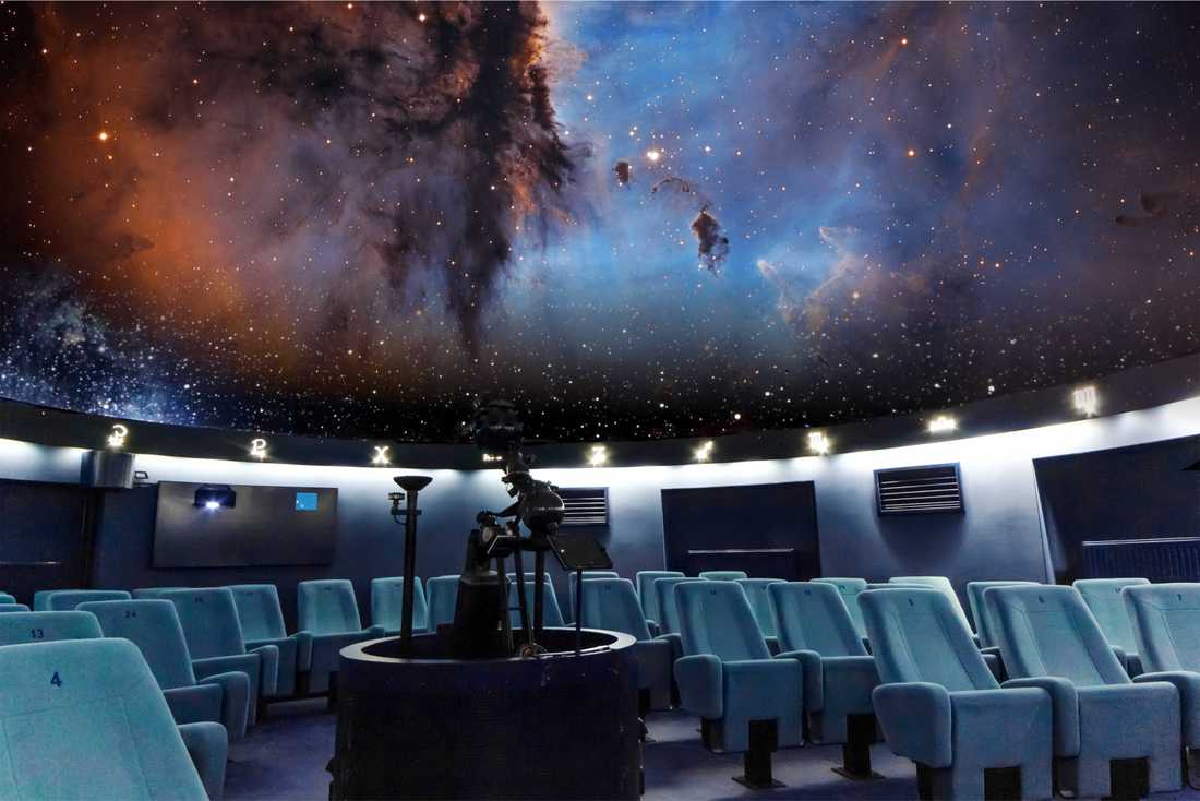 V přízemí pak najdete tu hlavní atrakci – digitální planetárium. Zpoza dveří sálu se zrovna tlumeně ozývá dunění hudby. Po chvíli se dveře pootevřou a vyběhne školní skupinka dětí a za nimi i lektor s tabletem v ruce. Ovládací prvky na displeji na vás asi budou působit vesmírně, zatímco vám lektor Jakub Šimánek vysvětlí, co všechno se v planetáriu promítá. „Je to noční obloha, planety, galaxie, fotky i videa, průlety vesmírem a celé filmy v rozlišení 4k. Letos chystáme několik premiér, třeba 16. 5. poprvé uvádíme film „Vesmírní parťáci“, který ocení děti i jejich rodiče. Vypraví se na dobrodružnou cestu do kosmu a dozví se o úžasných vlastnostech světla. Kromě živě komentovaných a autorsky komponovaných pořadů do programu vybíráme také filmy o vesmíru, které nám přijdou nejen atraktivní či vtipné, ale hlavně mají vysokou vzdělávací úroveň, ať už jsou pro děti či dospělé.“