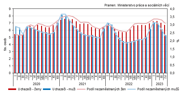 Ke konci dubna 2023 byl v ČR podíl nezaměstnaných osob 3,6 %. V rámci mezikrajského srovnání byla k 30. 4. 2023 zaznamenána nejvyšší nezaměstnanost v krajích Ústeckém a Moravskoslezském. Nejnižší nezaměstnanost byla ve Zlínském kraji. Meziměsíčně se nezaměstnanost snížila ve všech krajích ČR. Největší pokles podílu nezaměstnaných osob byl v Jihočeském kraji a v Kraji Vysočina (−0,3 p. b.).