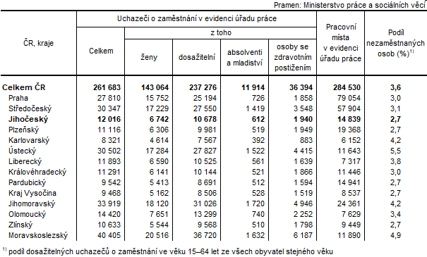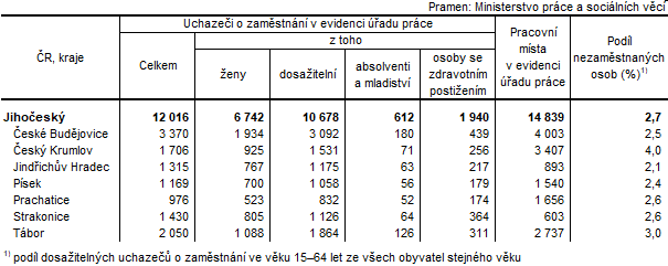 Podíl nezaměstnaných osob (počet dosažitelných uchazečů o zaměstnání ve věku 15–64 let/ počet obyvatel ve věku 15–64 let) dosáhl koncem dubna v Jihočeském kraji hodnoty 2,7 %. V rámci mezikrajského srovnání byl nejnižší podíl nezaměstnaných osob opět ve Zlínském kraji. Naopak nejvyšší podíl byl zaznamenán v Ústeckém kraji.