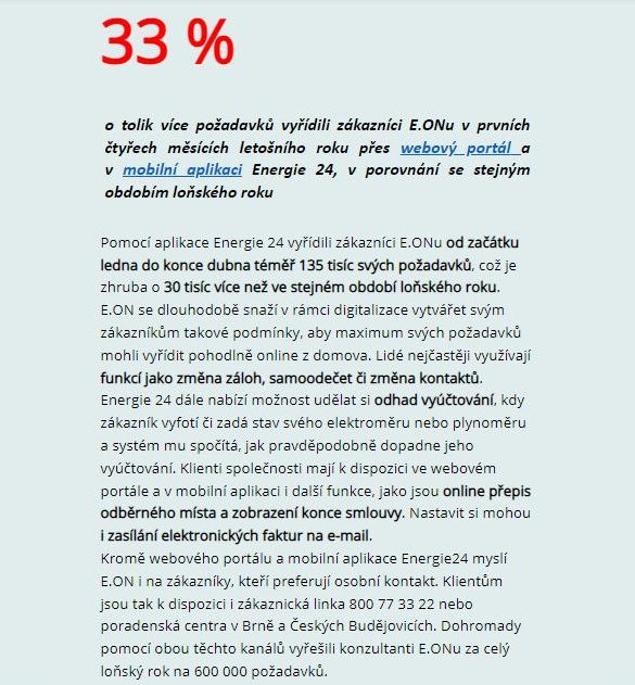 E.ON V ČÍSLECH: 33 % – o tolik více požadavků vyřídili zákazníci E.ONu v prvních čtyřech měsících letošního roku přes webový portál a v mobilní aplikaci Energie 24, v porovnání se stejným obdobím loňského roku