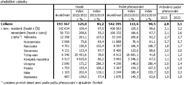 V HUZ celé České republiky se v 1. čtvrtletí 2023 oproti stejnému období minulého roku zvýšil počet ubytovaných hostů o více než třetinu a počet přenocování o více než čtvrtinu, to vše zejména díky zahraniční klientele. K dosažení výsledků 1. čtvrtletí 2019 však nerezidentům a jejich přenocování chybělo ještě téměř 20 %, což se promítlo i do výpadku celkového počtu hostů a jejich přenocování (−5 %, resp. −7 %). Počet rezidentů a jejich noclehů již hodnoty před pandemií překročil (+7 %, resp. +5 %).