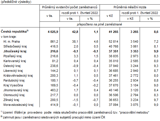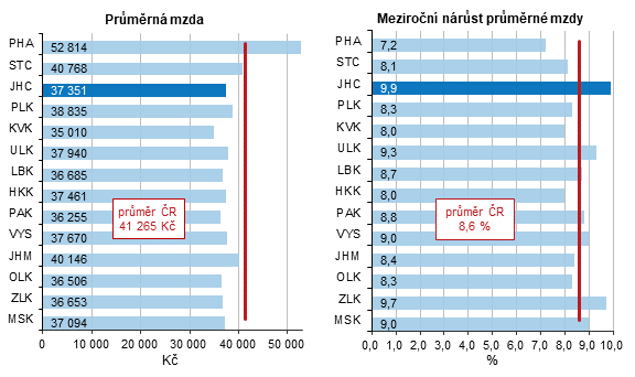 Podle dosažené hodnoty průměrné mzdy se Jihočeský kraj umístil na osmé příčce. Při porovnání přírůstku mzdy v 1. čtvrtletí 2023 v absolutních hodnotách obsadil Jihočeský kraj druhou nejvyšší příčku (+3 353 Kč), v relativním srovnání se Jihočeský kraj umístil dokonce na prvním místě (+9,9 %). Z pohledu absolutní výše průměrných mezd zaostávaly mzdy v Jihočeském kraji proti průměru za celou republiku o 3 914 Kč a proti průměru za hlavní město Prahu byl zaznamenán rozdíl téměř 15,5 tis. Kč. V rámci celé ČR mzdy rostly ve všech krajích. Nejvyšší přírůstek průměrné mzdy byl v absolutních hodnotách v hlavním městě Praze (+3 540 Kč), v relativním vyjádření byl nejvyšší v Jihočeském kraji (+9,9 %). Nejnižší nárůst v absolutních hodnotách byl zaznamenán v Karlovarském kraji (+2 585 Kč), v relativních hodnotách to bylo v hlavním městě Praze (+7,2 %). V hlavním městě tradičně zůstávají nejvyšší průměrné mzdy (52 814 Kč). Praha převyšovala průměrnou mzdu České republiky o téměř 28 %.