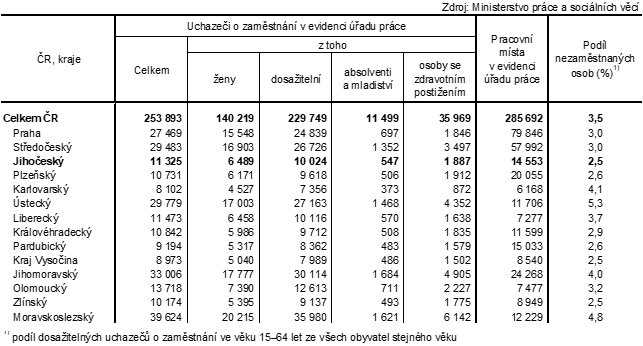 Nejpříznivější poměr mezi uchazeči o zaměstnání a volnými pracovními místy vykázalo v rámci mezikrajského srovnání hlavní město Praha (0,3 uchazeče na 1 volné pracovní místo). Nejméně příznivá situace byla v Moravskoslezském kraji, ve kterém na 1 pracovní místo připadalo 3,2 uchazečů.