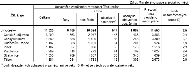 Ke konci měsíce května bylo na území Jihočeského kraje evidováno 11 325 uchazečů o zaměstnání, z toho dosažitelných bylo 10 024 osob. Meziměsíčně se počet nezaměstnaných osob v kraji snížil (−5,8 %). Obdobný trend vykazovaly všechny jihočeské okresy, zejména okres Jindřichův Hradec (−9,7 %).