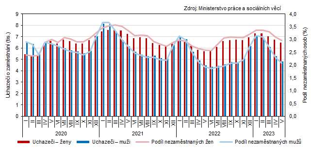 Ke konci května 2023 byl v ČR podíl nezaměstnaných osob 3,5 %. V rámci mezikrajského srovnání byla k 31. 5. 2023 zaznamenána nejvyšší nezaměstnanost v krajích Ústeckém a Moravskoslezském. Meziměsíčně se nezaměstnanost snížila ve všech krajích ČR. Největší pokles podílu nezaměstnaných osob byl v Olomouckém kraji (−0,2 p. b.).