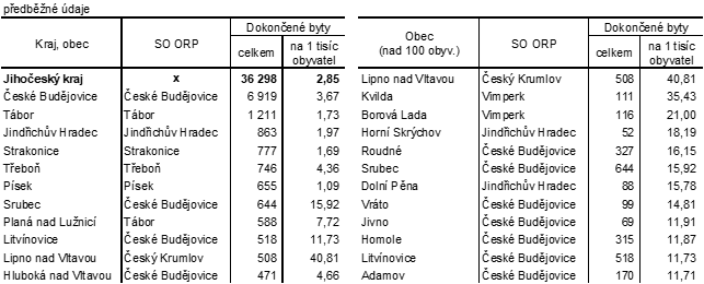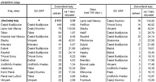 V jihočeských obcích bylo od roku 2003 dokončeno téměř 37 tis. bytů, přičemž pětina jich byla realizována na území krajského města. Kromě okresních měst, která se umístila na dalších místech pomyslného žebříčku, stojí za zmínku téměř 750 bytů dokončených ve městě Třeboň, 644 bytů zkolaudovaných v obci Srubec a také více než 500 bytů postavených v Lipně nad Vltavou.