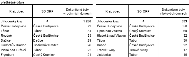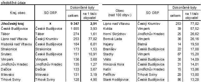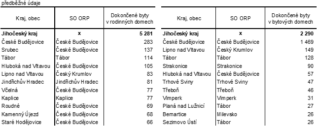 Nejvíce dokončených bytů vykázalo krajské město České Budějovice (1 855), druhý v pořadí byl Tábor s 274 byty a na třetí příčce se umístilo Lipno nad Vltavou, kde bylo za pět let dokončeno 253 bytů. Zde se však zřejmě jednalo spíše o tzv. druhé bydlení, tedy byty určené k rekreaci. V popředí žebříčku lze najít ještě okresní města Strakonice a Jindřichův Hradec. Na sedmé a deváté místo se poměrně překvapivě zařadila města Vimperk a Dačice, kde bylo v posledních pěti letech dokončeno 136, resp. 133 bytů.