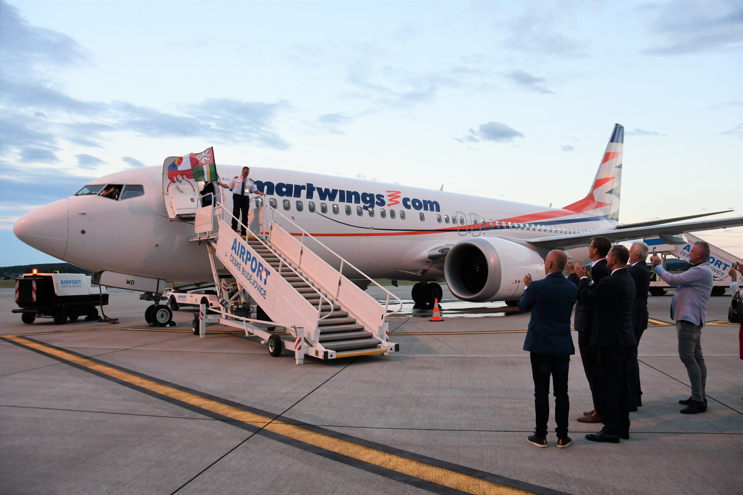 Prvním letadlem, které přistálo v Českých Budějovicích, je Boeing 737 MAX letecké společnosti Smartwings s registrací OK-SWD pro 189 cestujících v ekonomické třídě. Jeho kapitánem byl Jihočech Jiří Jirmus. Všechny překvapilo, když při se při přiblížení letounu k odletové hale objevila v okénku stroje jihočeská vlajka. „Jsem šťastnej jako blecha, že jsem to zrovna já. Děkuju naší společnosti, že mi dala tu příležitost provést první let do Českých Budějovic. Počasí je nádherný, vždyť se podívejte, to je stejný jako v Turecku,“ okomentoval situaci Jirmus. Cestující v turecké Antalyi přistanou přibližně před půl druhou ráno ve čtvrtek 3. srpna 2023, kde na ně také čeká slavnostní přivítání.