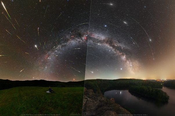 Čím dále od měst a zdrojů světelného znečištění pozorovatel bude, tím více meteorů spatří. Na obrázku je porovnání Parku tmavé oblohy Poloniny (vlevo) a Sečské přehrady (vpravo). Poloniny leží stovky kilometrů od velkých měst, kdežto Seč pouze desítky. Lze tedy vidět, že nad Sečskou přehradou jsou podmínky horší. Foto: Tomáš Slovinský (vlevo) a Petr Horálek (vpravo).