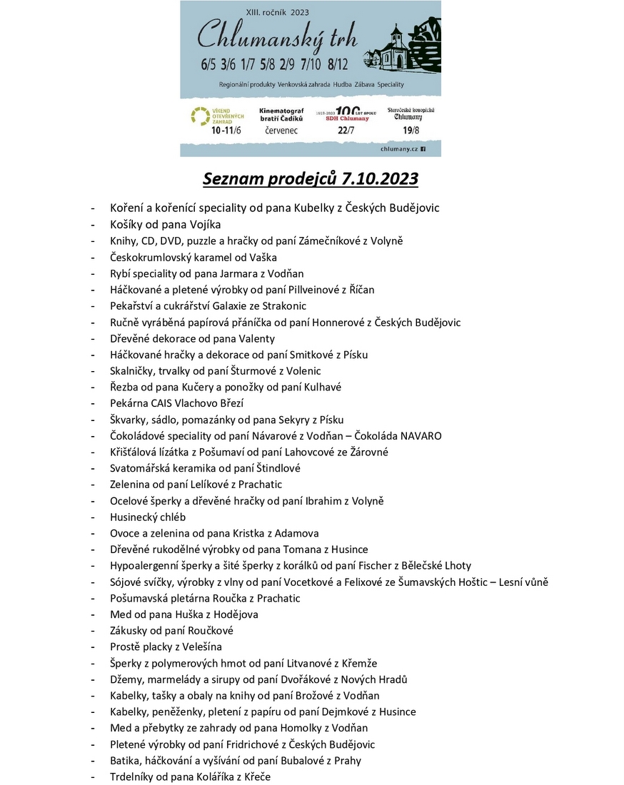 Domů ŽIVOT KOLEM NÁS JIŽNÍ ČECHY: Chlumanský trh bude opět tuto sobotu. Přihlášeni jsou tito prodejci