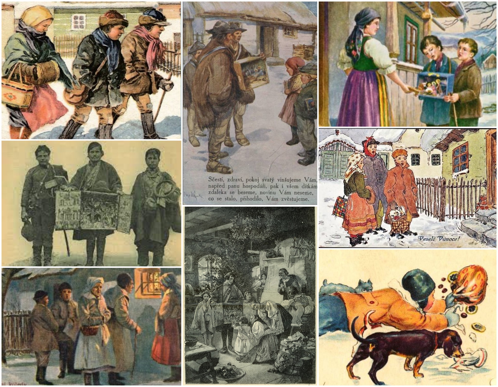 Do slavnostní rodinné atmosféry se v minulosti prolínaly hlasy a zpěv koledníků, kteří od Štědrého dne obcházeli domy doprovázeni skromnou muzikou. Pokud byly venku nízké teploty, vybírali koledníci kratší koledy. Zpívaly se koledy místně známé, s dlouhými řadami slok, často jednoduché melodie. Doprovodné nástroje byly přirozeně přenosné odpovídající regionu – housle, dudy, píšťaly, přenosný cimbálek, moldánky, harfička.