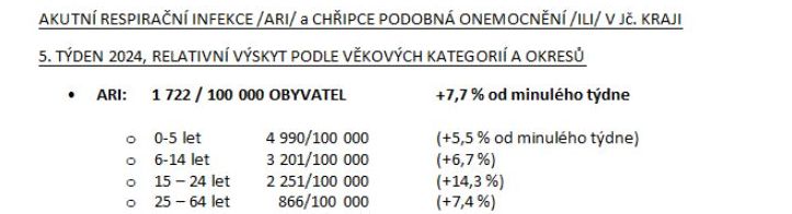 V 5. týdnu roku 2024 byl počet akutních respiračních infekcí /ARI/ v Jihočeském kraji 1 722 případů na sto tisíc obyvatel kraje (+7,7 % od minulého týdne).