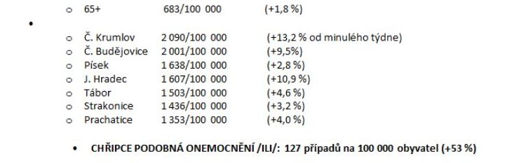 V pátém týdnu 2024 se v Jihočeském kraji zvýšil počet akutních respiračních infekcí ve srovnání s týdnem předešlým o 7,7 % na 1 722 případů na sto tisíc obyvatel kraje a nemocnost tak v této sezoně poprvé dosáhla prahu epidemického výskytu. Vzrostla ve všech jihočeských okresech, nejvíce na Českokrumlovsku o 13,2 %, a překonala zde hranici dvou tisíc případů onemocnění na sto tisíc obyvatel (2 090/100 000). Výskyt chřipce podobných onemocnění (ILI) je 127 případů na sto tisíc obyvatel. Od předešlého týdne vzrostl o 53 %.