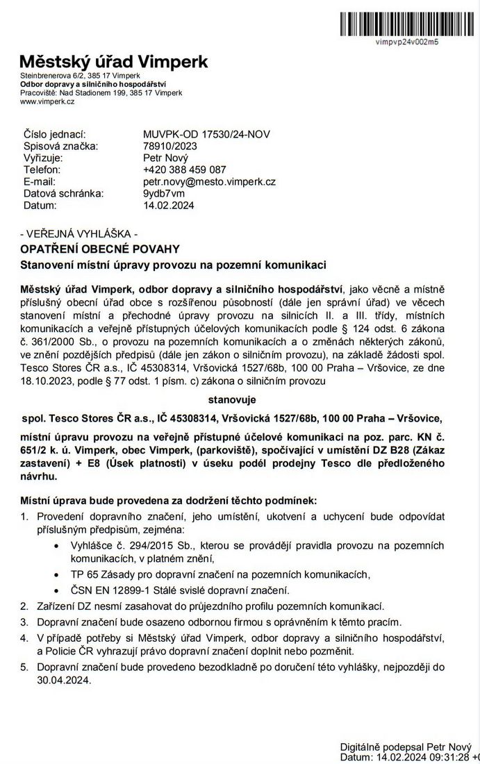 NAŠE MĚSTO VIMPERK: Vyhláška. Úprava provozu na parkovišti u Tesca