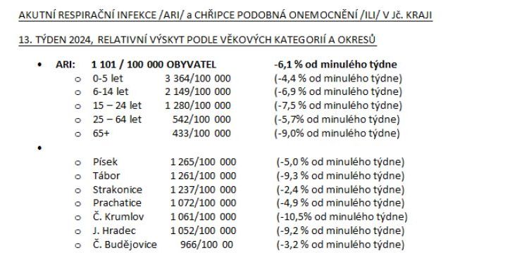 Ve třináctém týdnu v Jihočeském kraji opět poklesl počet akutních respiračních infekcí ve srovnání s týdnem předešlým, tentokráte o -6,1 % na 1 101 případů na sto tisíc obyvatel. Nemocnost klesla ve všech okresech a všech věkových kategoriích. Nejvyšší je aktuálně na Písecku, kde je 1 265 případů na sto tisíc, nejnižší je na Českobudějovicku (966/100 000).