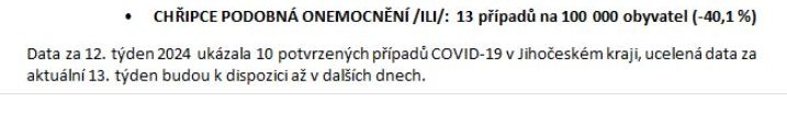 JIŽNÍ ČECHY: Aktuální informace hygieniků kraje o nemocnosti – 13. týden ´24