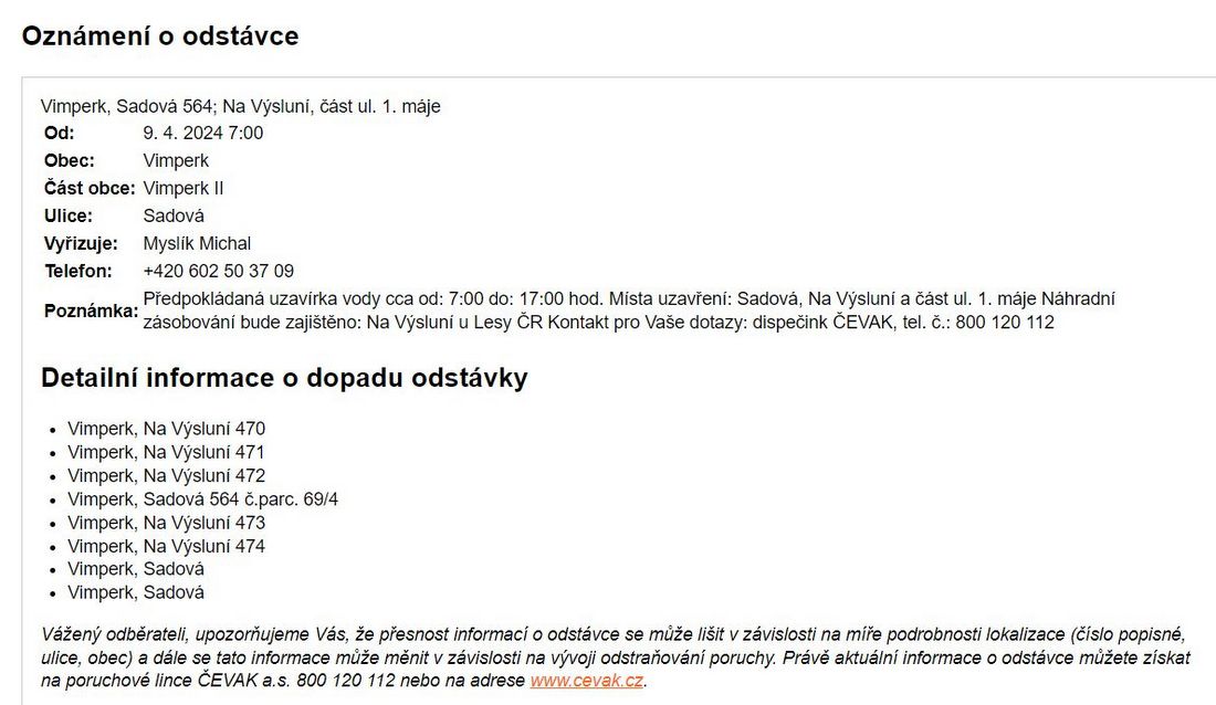 NAŠE MĚSTO VIMPERK: Oznámení o přerušení dodávky pitné vody – 9. 4.
