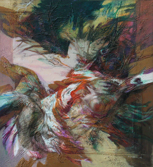 Obrazy, které uvidíte, se přenesly z výstavy z galerie Tuwora ze zámku Nebílovy z plzeňského kraje. Její název, “Krajina – ticho – člověk” je oslavou přírody a její podstatnou součástí člověka. Člověk v tichu prochází krajinou, při jeho cestě ho provázejí říčky, potoky, lesnaté pahorky, travnaté louky, jiskřící slunce. Silný akcent v malířově tvorbě je směřován na existenci a nekonečnou proměnu přírody. Je však inspirován také její odvrácenou tváří. Maluje sice krajinu plnou různých chutí a vůní, ale zajímá jej také možnost nahlédnout do útrob země, plné práchnivějících kořenů fosforečné barvy, tlejícího listí, ukrytých kamenů s dávnou minulostí. V konečném výsledku vytváří barevné a tvarové kroky, které jsou poskládané tak, že tvoří dokonalou kompozici.