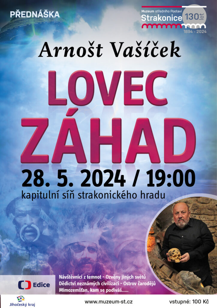 Arnošt Vašíček za desítky let pátrání po záhadách a tajemných jevech projel téměř celý svět včetně mnoha odlehlých koutů obývaných primitivními etniky. Přednáška přinese svědectví o podivuhodných setkáních a především záznamy překvapivých a někdy i velmi tajemných událostí, které se mu na jednotlivých výpravách přihodily.