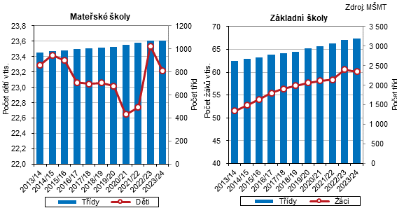 Na základních školách v kraji vyučuje ve školním roce 2023/2024 celkem 4 510 učitelů. Podíl vyučujících mužů je v porovnání s mateřskými školami vyšší (16,5 % z celkového počtu učitelů), přesto výrazně převažují ženy. Na jednu třídu připadá ve sledovaném školním roce v průměru 18,9 žáků a na 1 vyučujícího 13,3 žáků.