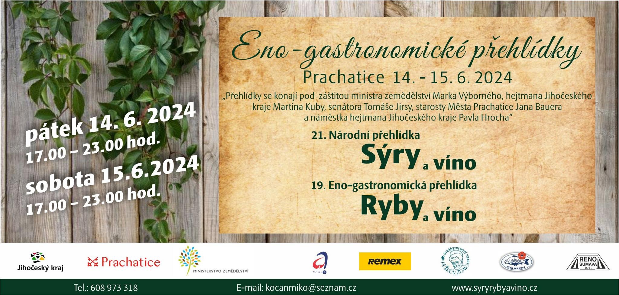 Zveme vás na tradiční eno-gastronomické přehlídky – sýry, ryby a víno, pořádané v historických prostorách Staré radnice – radničním sále, radničním sklepení a na arkádovém nádvoří, Velké náměstí 1, Prachatice ve dnech 14. –15. června v čase 17–23 hodin.