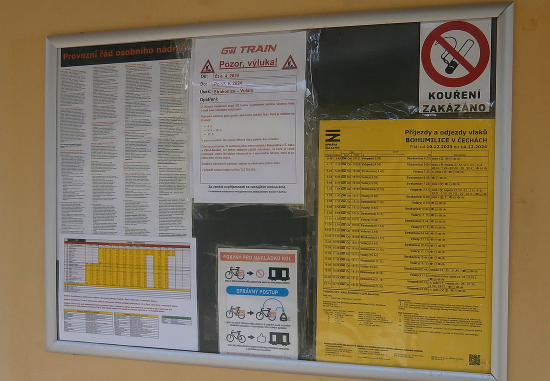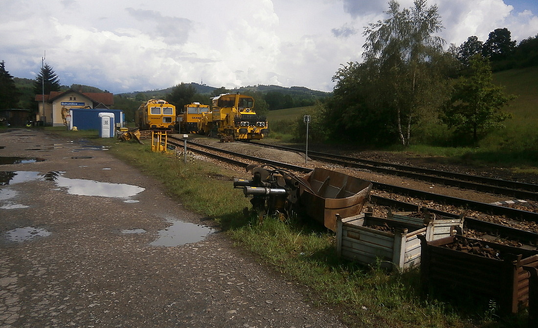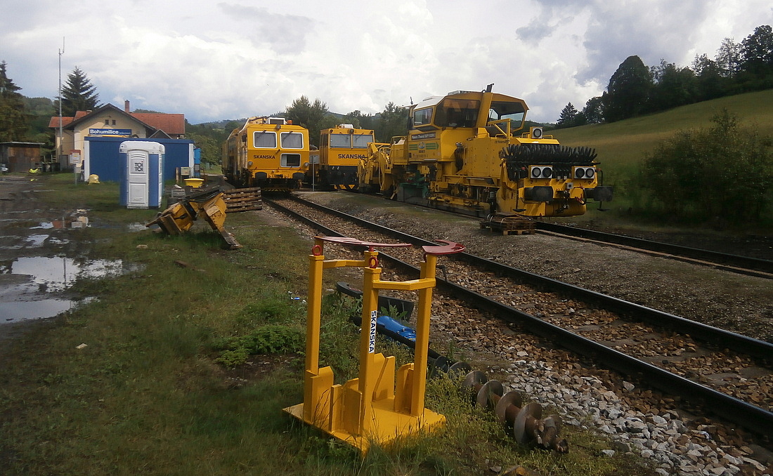 V současných dnech (až do 17. června) je na železniční trati ze Strakonic do Volar výluka kvůli opravám a výměně kolejového roštu. Některé stroje odpočívaly v sobotu 25. května v zastávce Bohumilice v Čechách. Jiné, na dalších úsecích trati, pracovaly i o víkendu naplno.