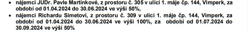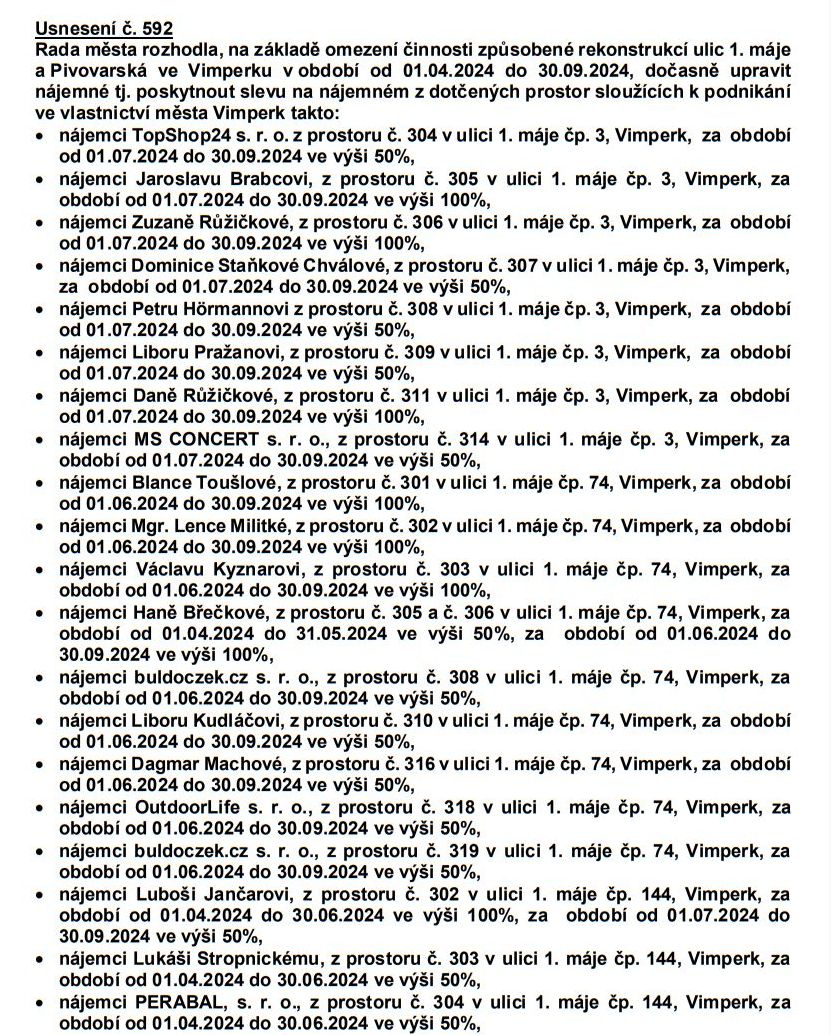 Rada města rozhodla, na základě omezení činnosti způsobené rekonstrukcí ulic 1. máje a Pivovarská ve Vimperku v období od 01.04.2024 do 30.09.2024, dočasně upravit nájemné tj. poskytnout slevu na nájemném z dotčených prostor sloužících k podnikání ve vlastnictví města Vimperk takto: