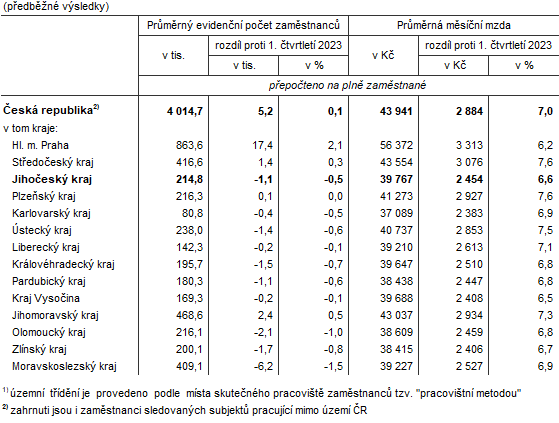 Z pohledu počtu zaměstnanců došlo v 1. čtvrtletí 2024 ve většině krajů k mírnému meziročnímu poklesu. Nejvyšší pokles byl zaznamenán v Moravskoslezském kraji (−6,2 tis.). Výraznější nárůst počtu zaměstnanců byl naopak zaznamenán v hl. městě Praze (+17,4 tis). V Jihočeském kraji bylo v 1. čtvrtletí 2024 zaměstnáno 214,8 tis. zaměstnanců, což bylo 1,1 tis. méně než před rokem.