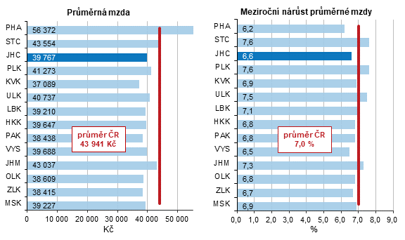 Z pohledu absolutní výše průměrných mezd zaostávaly mzdy v Jihočeském kraji proti průměru za celou republiku o 4 174 Kč a proti průměru za hlavní město Prahu byl zaznamenán rozdíl téměř 16,6 tis. Kč. V rámci celé ČR mzdy rostly ve všech krajích. Nejvyšší přírůstek průměrné mzdy byl v absolutních hodnotách v hlavním městě Praze (+3 313 Kč), v relativním vyjádření ve Středočeském a Plzeňském kraji (+7,6 %). Nejnižší nárůst v absolutních hodnotách byl zaznamenán v Karlovarském kraji (+2 383 Kč), v relativních hodnotách to bylo v hlavním městě Praze (+6,2 %). V hlavním městě tradičně zůstávají nejvyšší průměrné mzdy (56 372 Kč). Praha převyšovala průměrnou mzdu České republiky o více než 28 %.