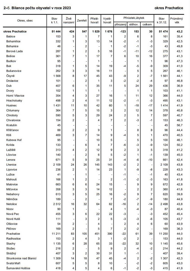 ŘEČÍ ČÍSEL: Počet obyvatel ve městech a obcích Prachaticka v roce 2023