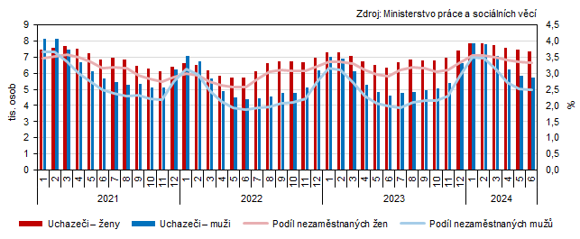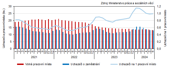 Na jedno volné pracovní místo v evidenci úřadu práce připadal k 30. červnu 2024 v celé ČR 1 uchazeč. Nejpříznivější poměr mezi uchazeči o zaměstnání a volnými pracovními místy vykázalo v rámci mezikrajského srovnání hlavní město Praha (0,4 uchazeče na 1 volné pracovní místo). Nejméně příznivá situace byla v Moravskoslezském kraji, ve kterém na 1 pracovní místo připadali téměř 4 uchazeči.