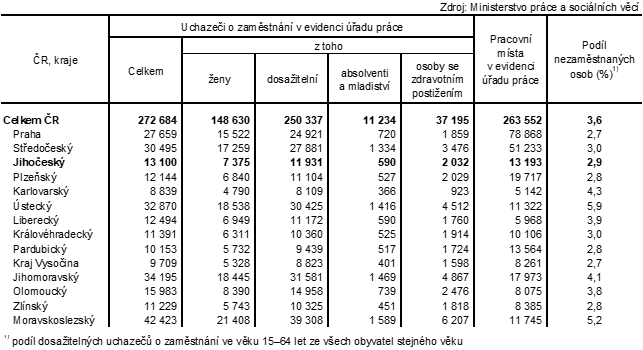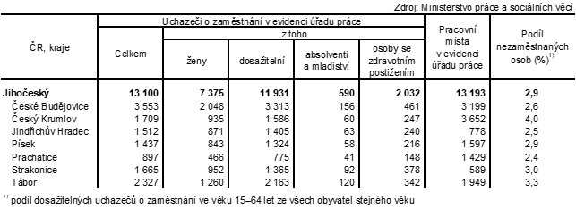 Meziročně vzrostl počet uchazečů o zaměstnání v evidenci úřadu práce v Jihočeském kraji o 19,7 %. Průměrná délka evidence byla 342 dní. Dosažitelných uchazečů, tedy těch, kteří jsou schopni nastoupit do pracovního poměru okamžitě při nabídce vhodného pracovního místa, bylo z celkového počtu nezaměstnaných v kraji 91,1 %.